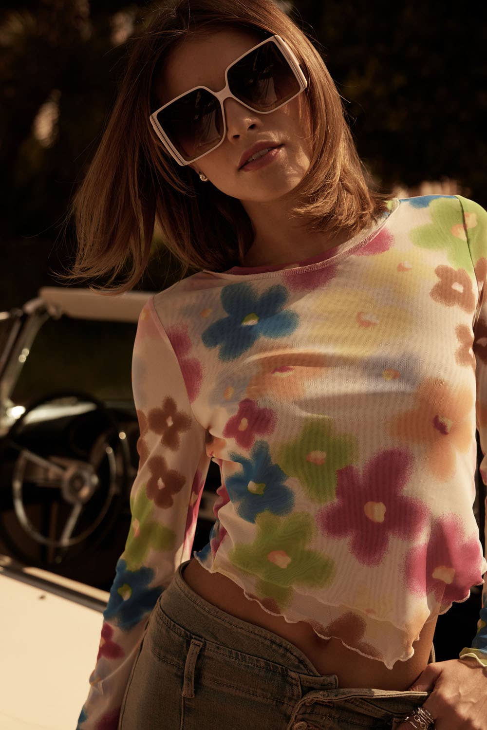 semi-sheer fabric. boat neckline. long sleeves. bandana hem. lettuce hem and cuffs. cropped length. relaxed fit. lined front bodice.