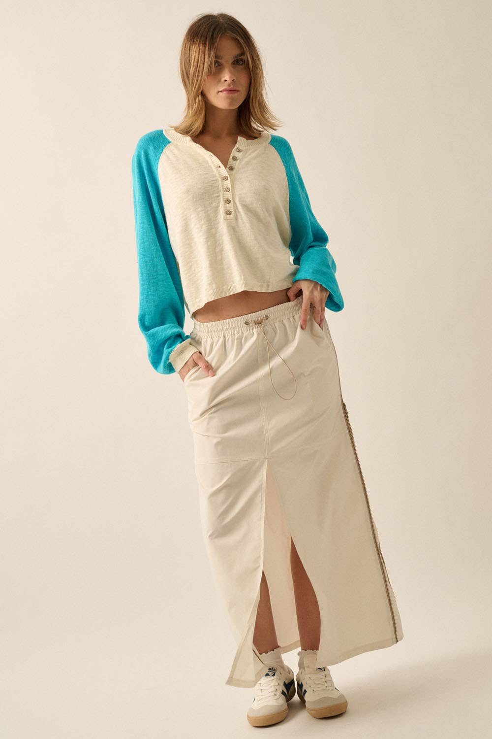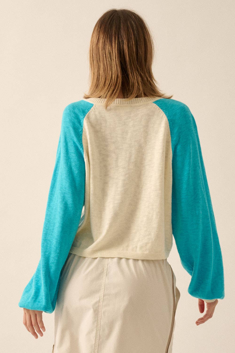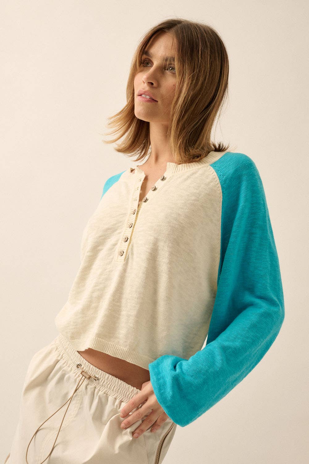 A colorblock slub-knit sweater with the following features: Round neckline. Half-button henley closure. Long raglan sleeves. Rib-knit collar, cuffs, and hem. Loose fit.